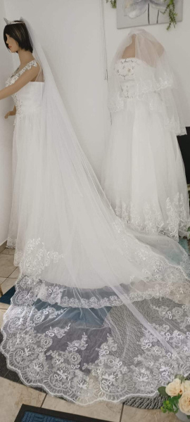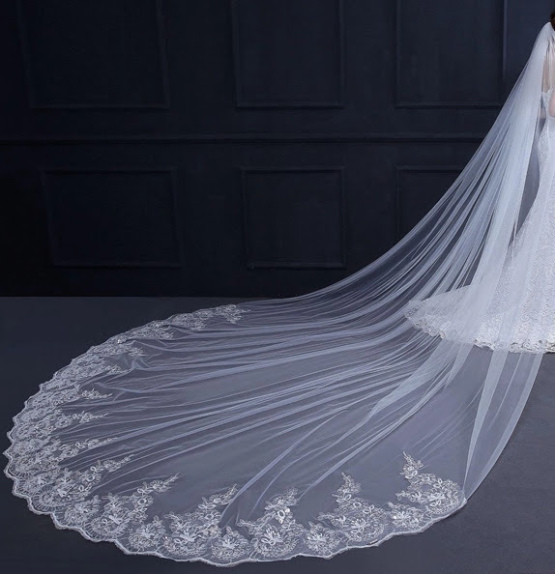 Velo  estilo catedral con encaje de boda largo y lujoso con lentejuelas blanco marfil, una capa con peine 3 mts. $60